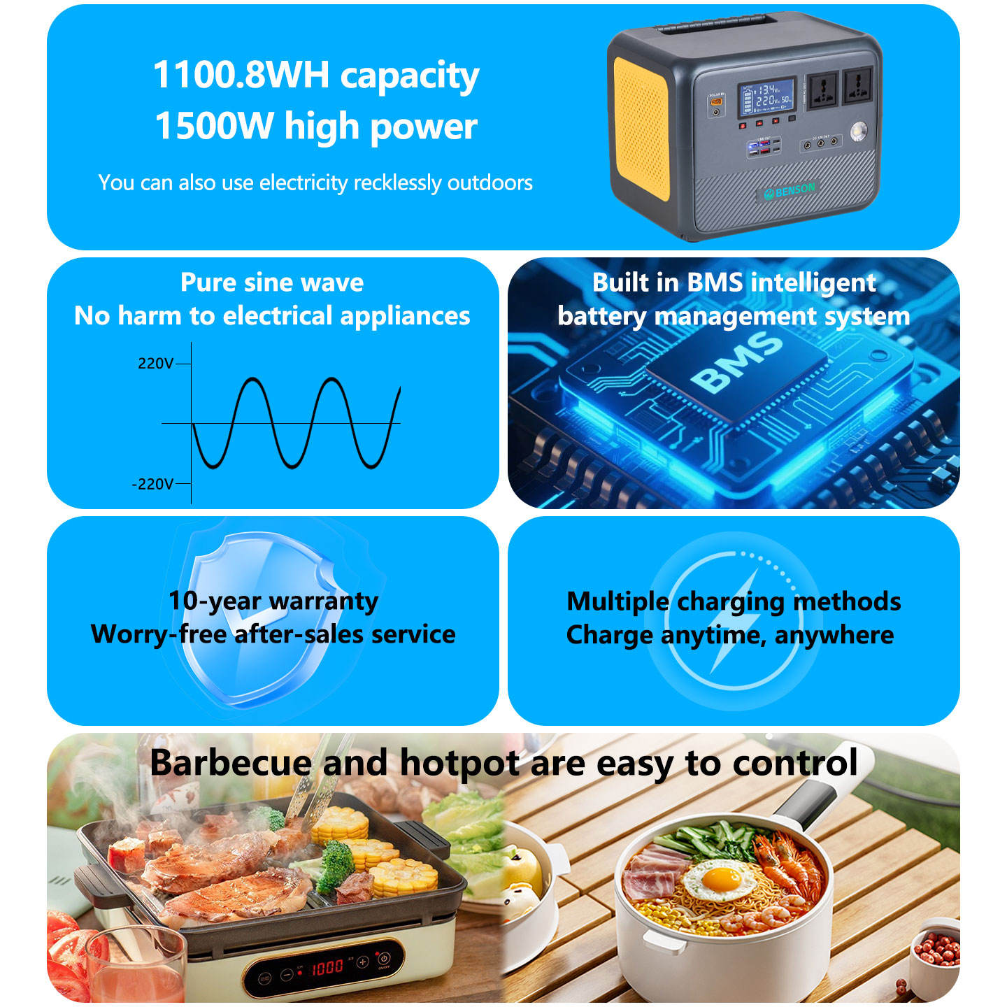 BENSON LX-ABS11 1000W Fast Charging LiFePO4 Portable Power Bank Pure Sine Wave Solar Panel Home Outdoor Emergency Energy Storage