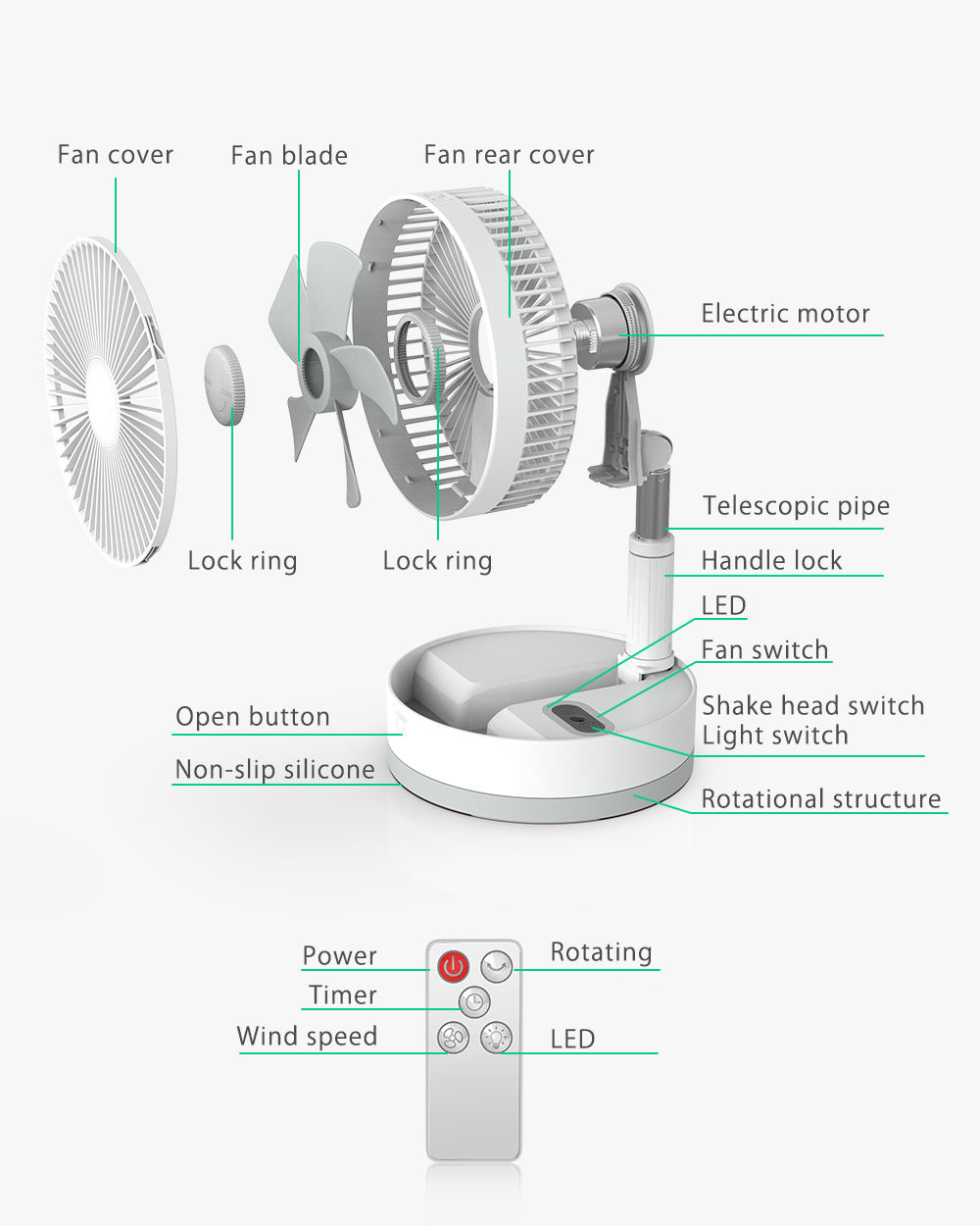 ADYSS Usb Foldable Rechargeable Telescopic Mini Desktop Handhold Folding Portable Rotatable Base Wireless Remote Control Fan