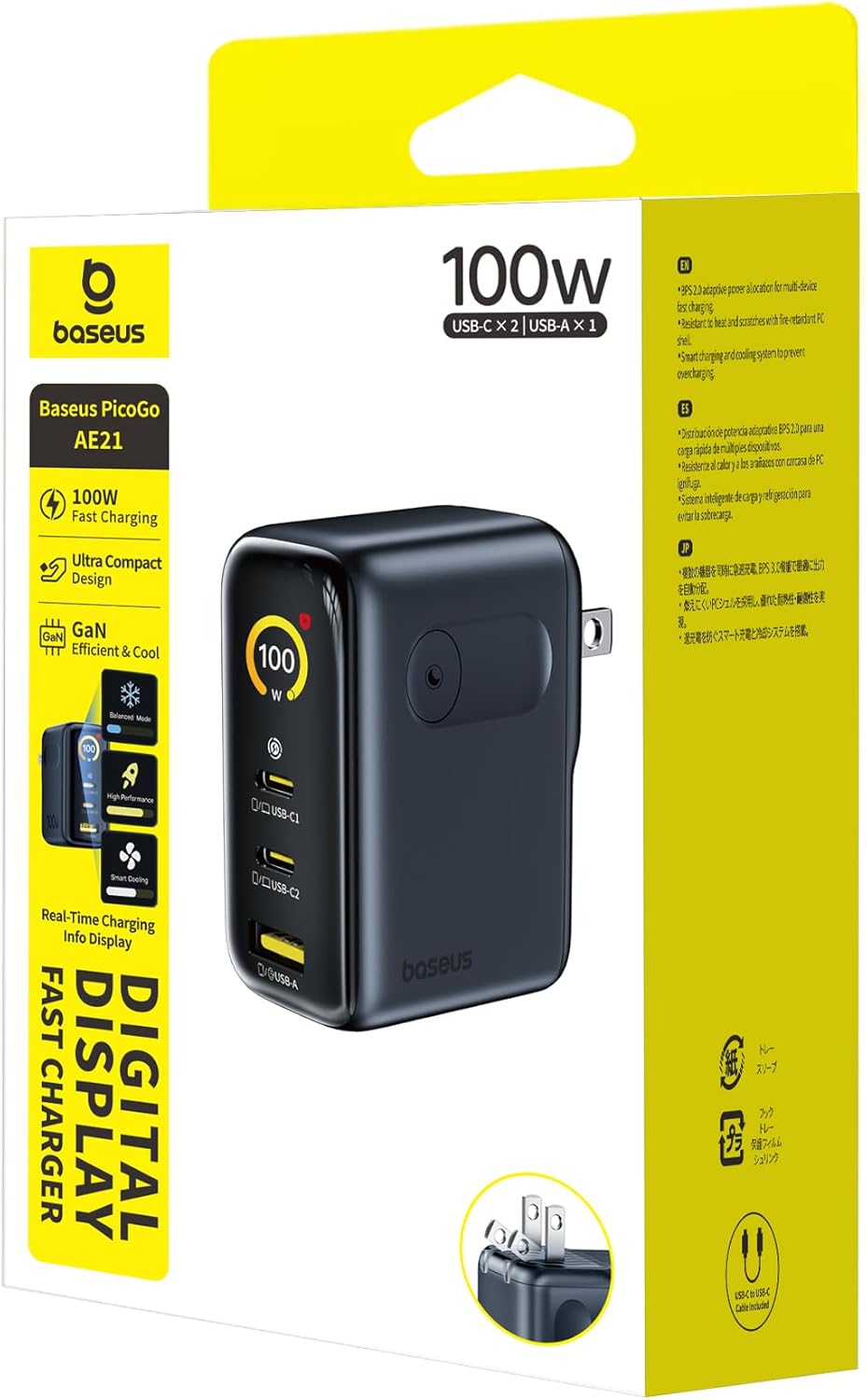 Baseus Picogo 100W USB C Charger, 3-Port Multi-Device Fast Charging Laptop Charger with Smart Display & Touch Control
