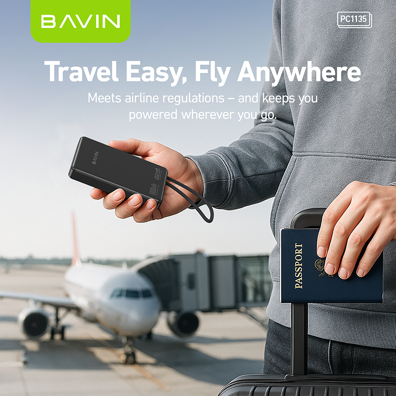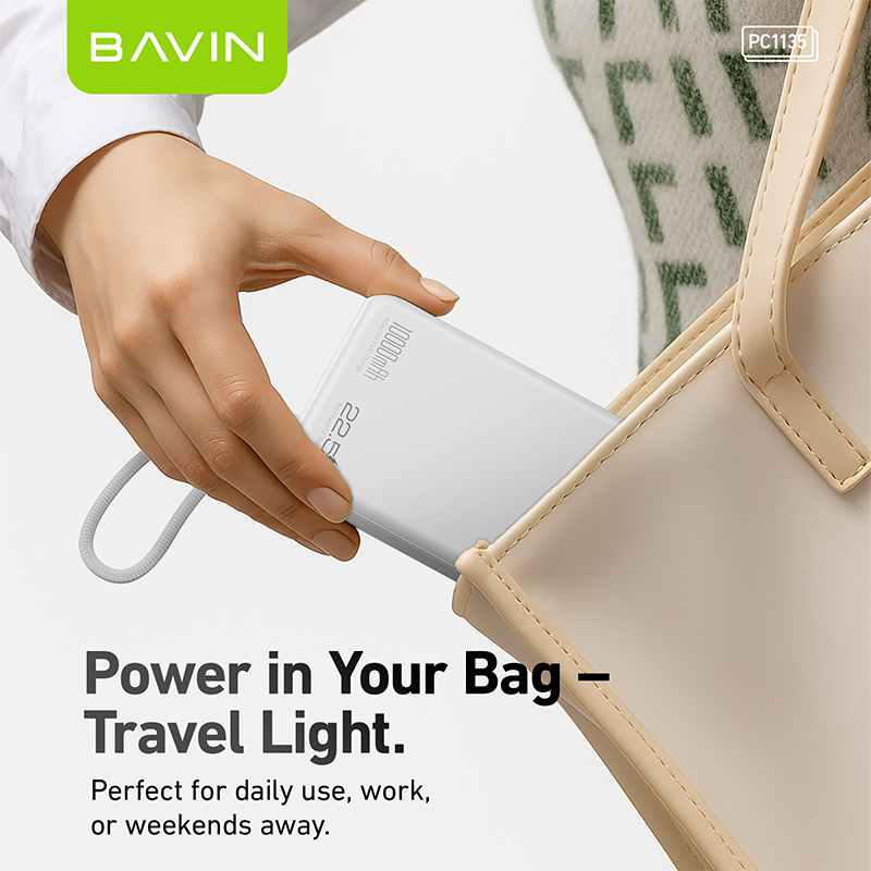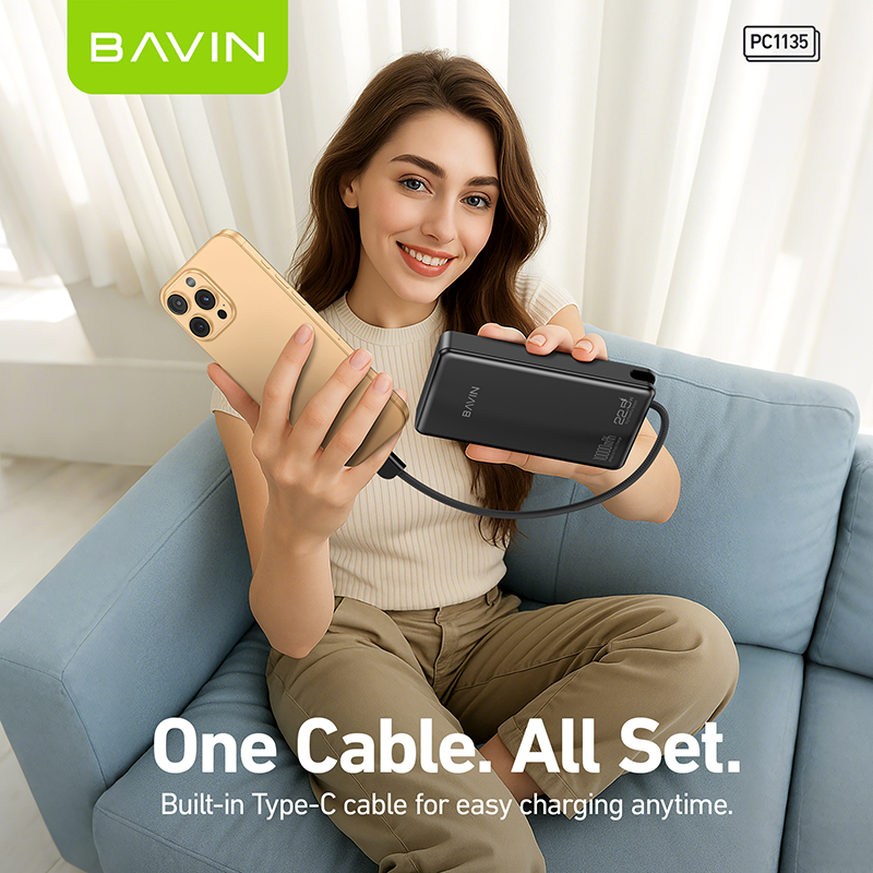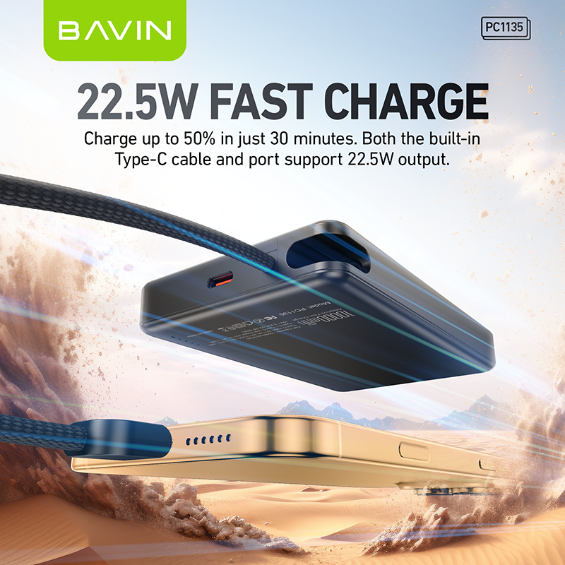 BAVIN PC1135 10000mah 22.5W LED Digital Display Ultra Thin Power Bank with Nylon Type C Usb Cable