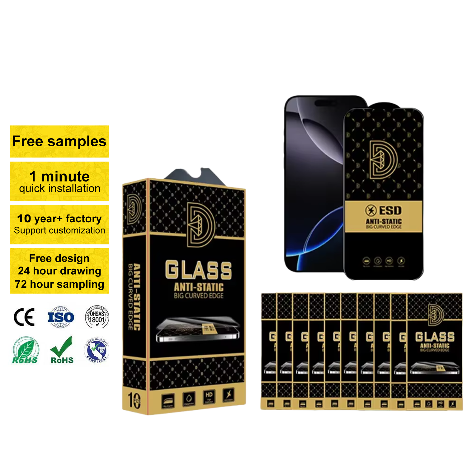 Golden Diamond Anti-static Esd 0.4mm Full Cover 9h Tempered Glass Screen Protector For Iphone 13 16 15 Pro 17 Pro Max 15 Plus -