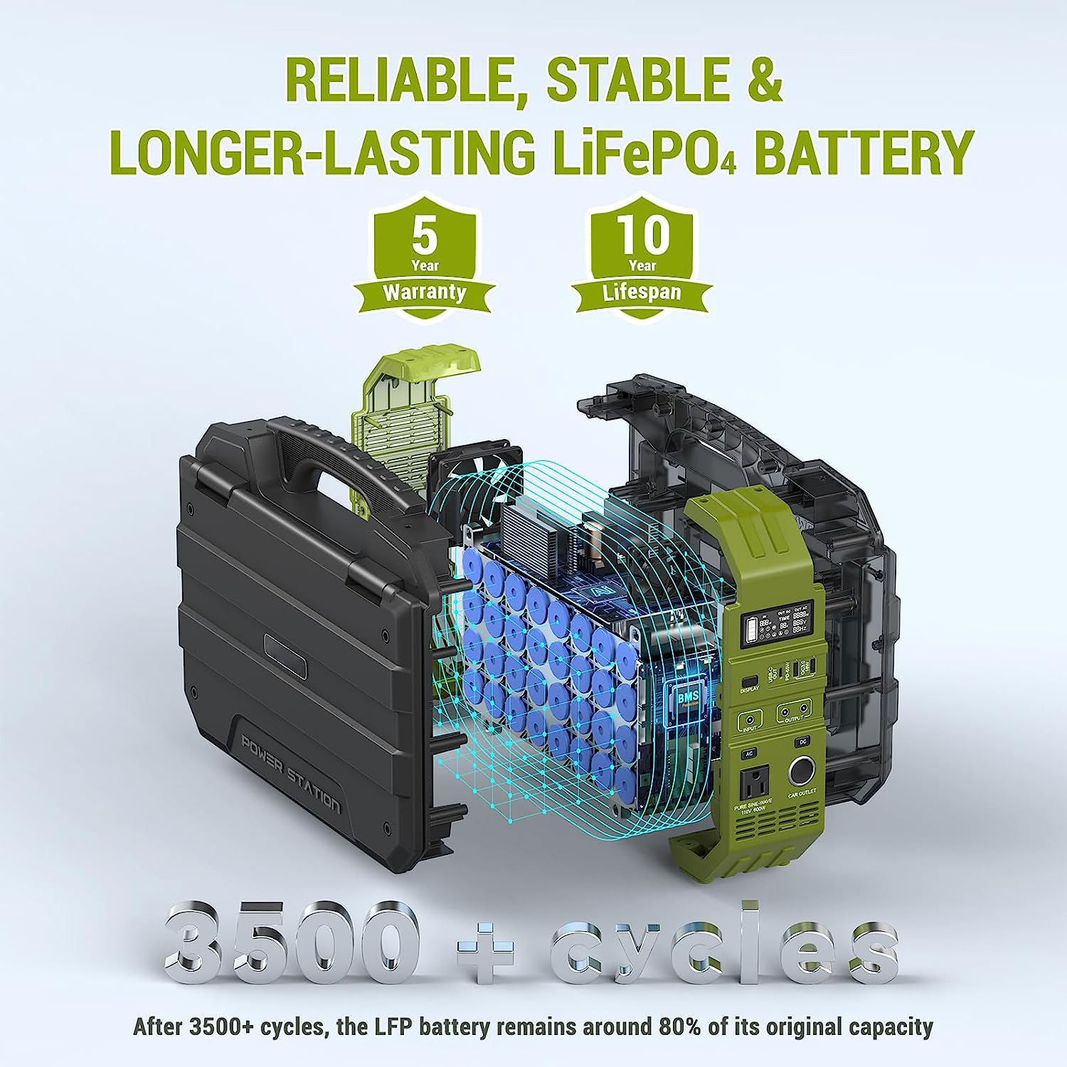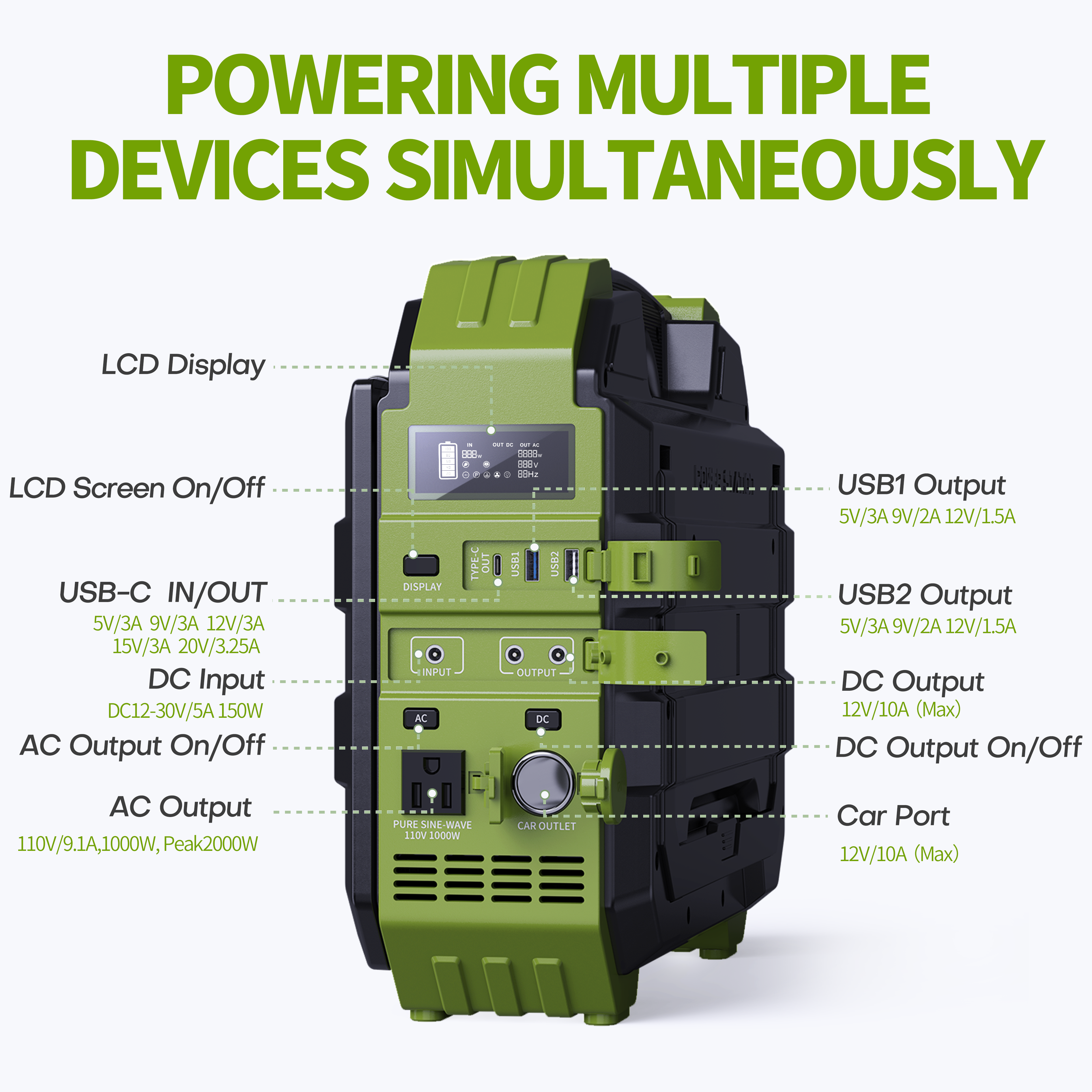 1000W Solar Powered Camping Generator with Built-In Solar Panel 192000mAh LiFePO4 Battery Pack for Outdoor Use