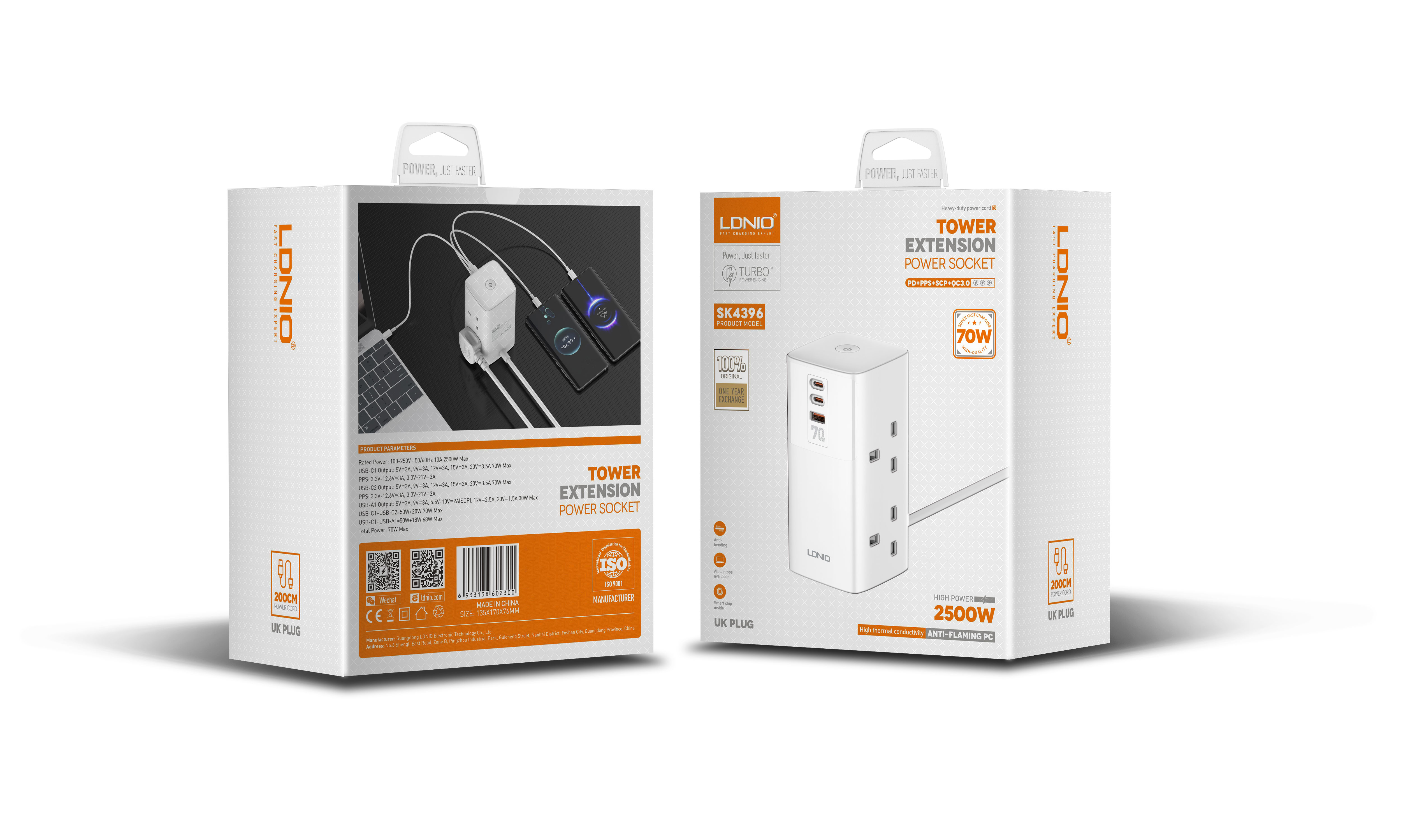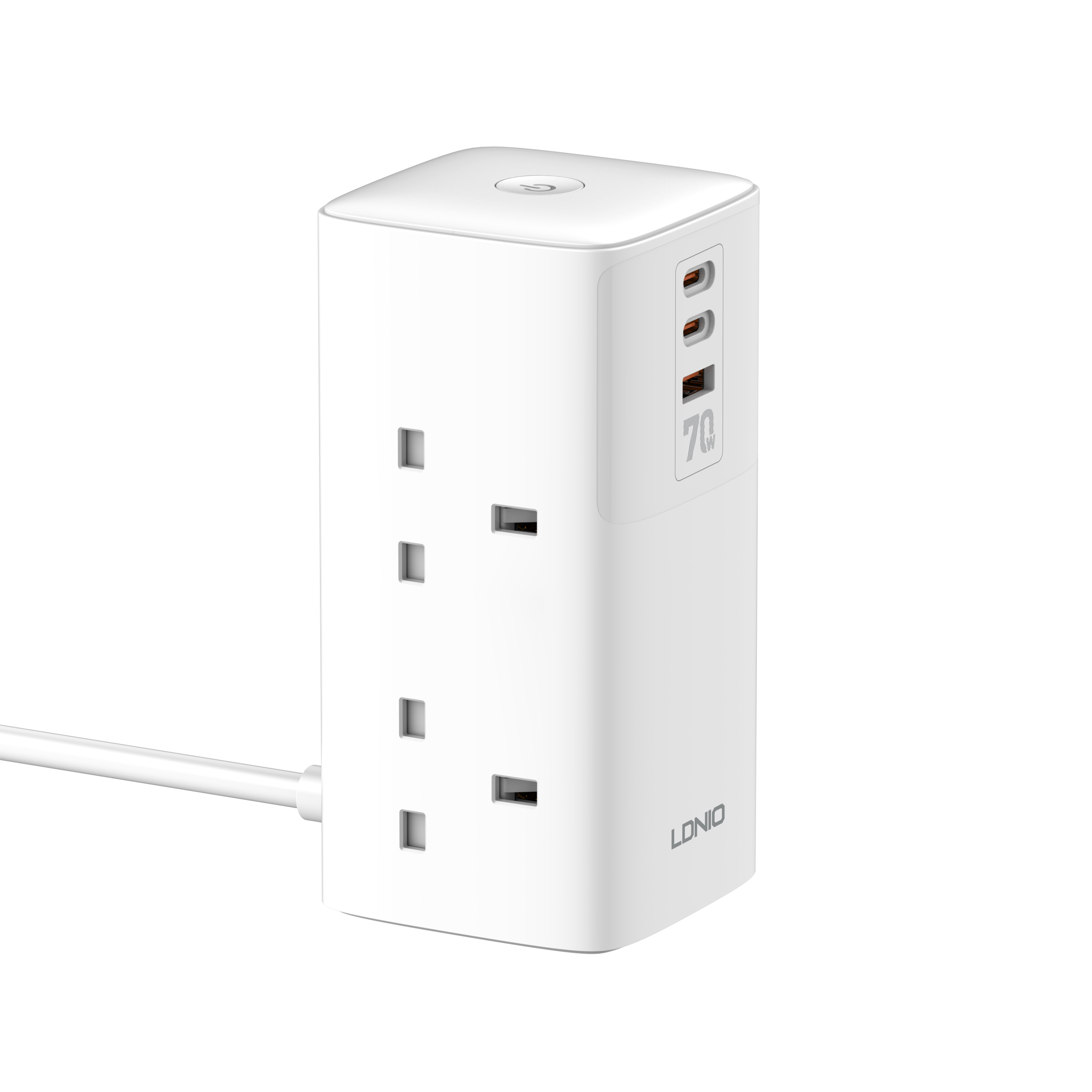 LDNIO--Power Strip--SK4396 2500W Tower Extension 4 Power Sockets+70W Super Fast Charging:2USB-C+USB-A