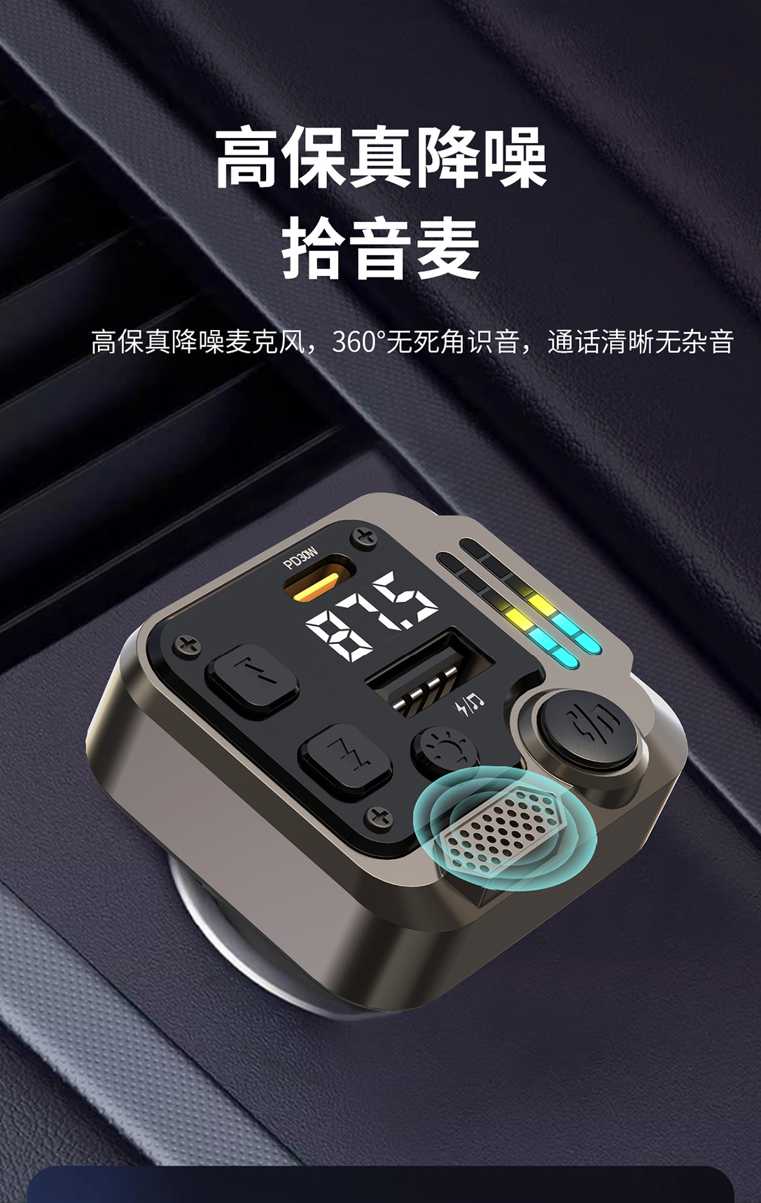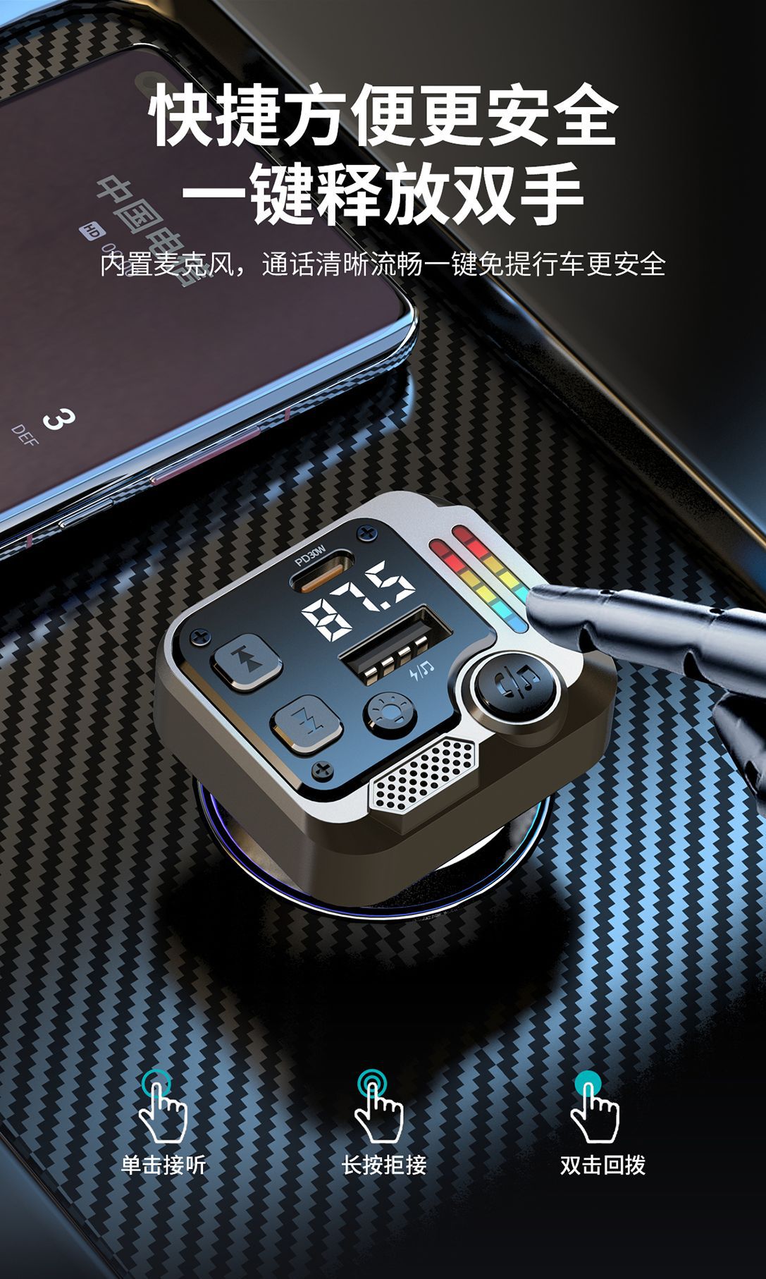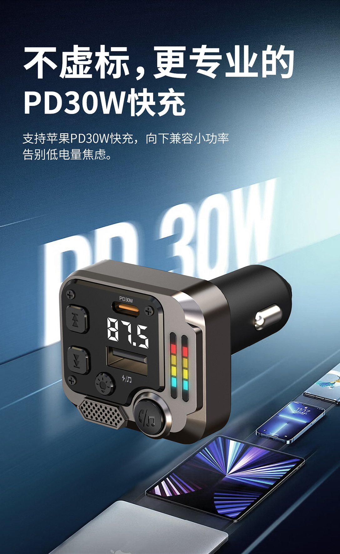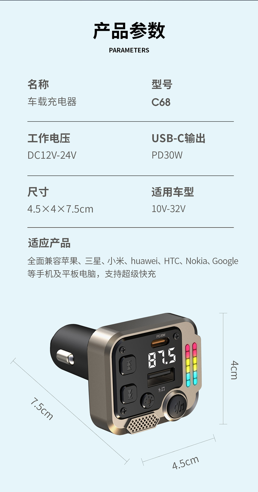 KAIWEIDI -C68PD300000 fast charging car charger, fast charging Bluetooth MP3 player, car cigarette lighter, digital display