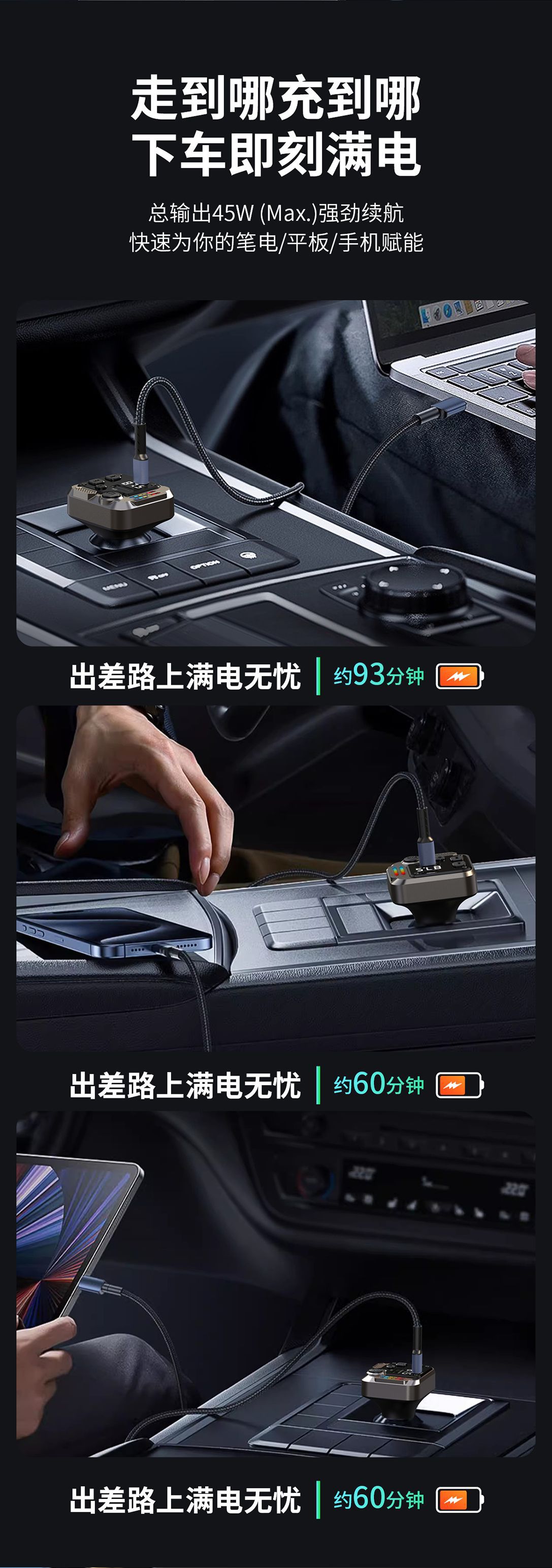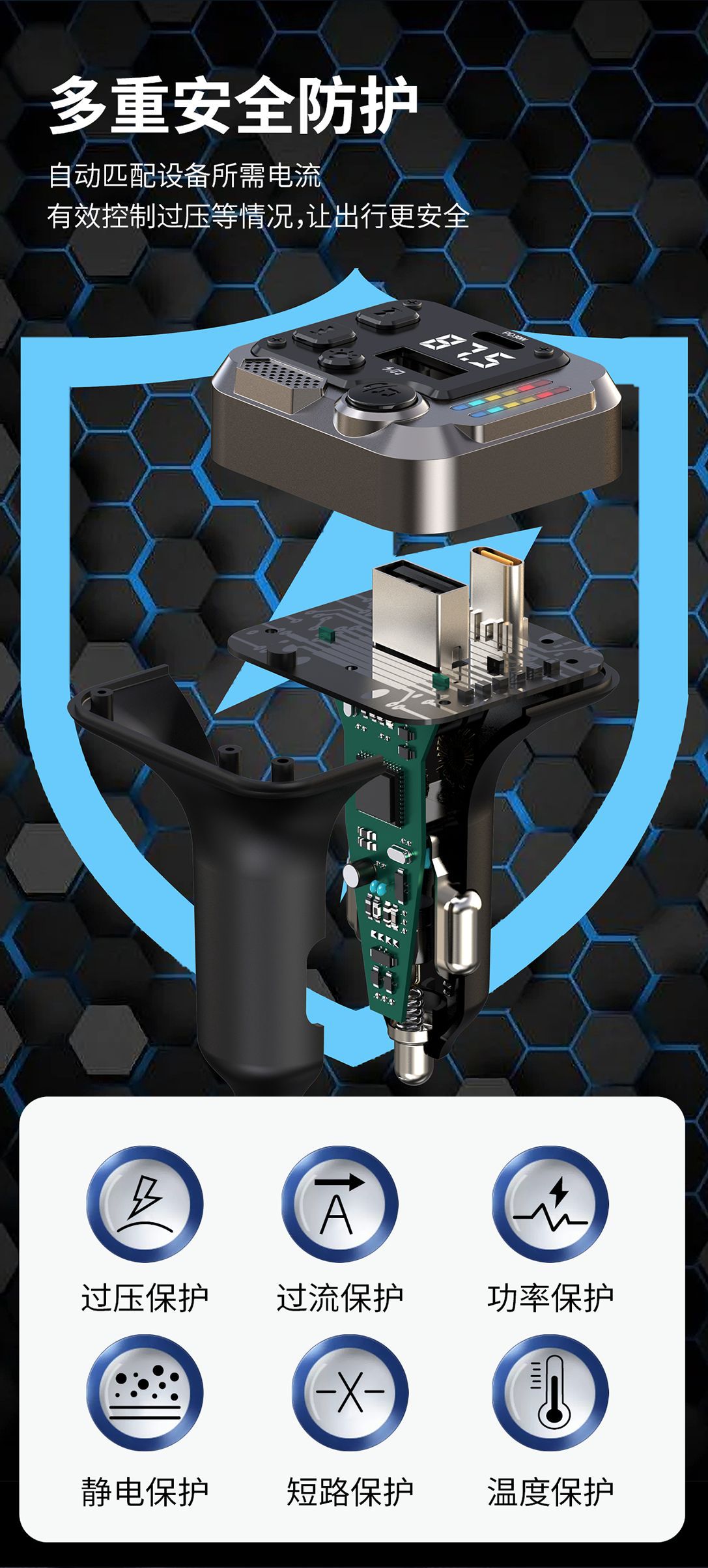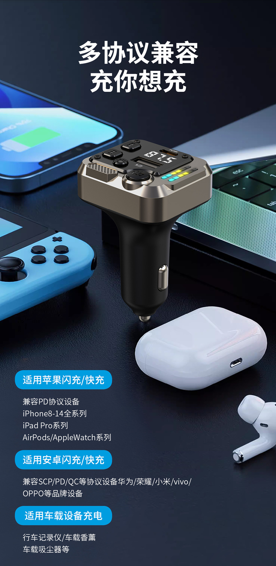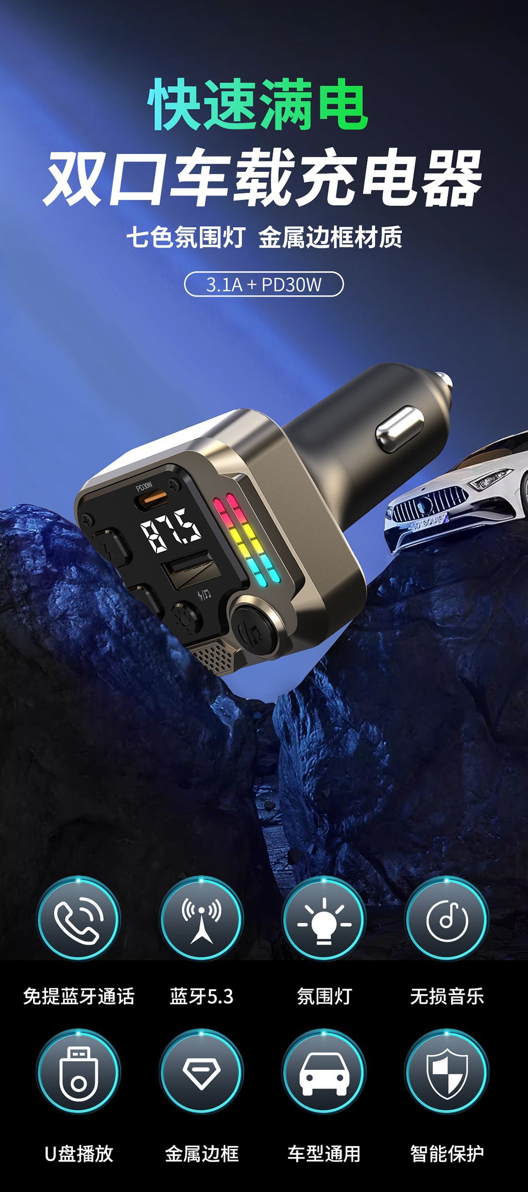KAIWEIDI -C68PD300000 fast charging car charger, fast charging Bluetooth MP3 player, car cigarette lighter, digital display