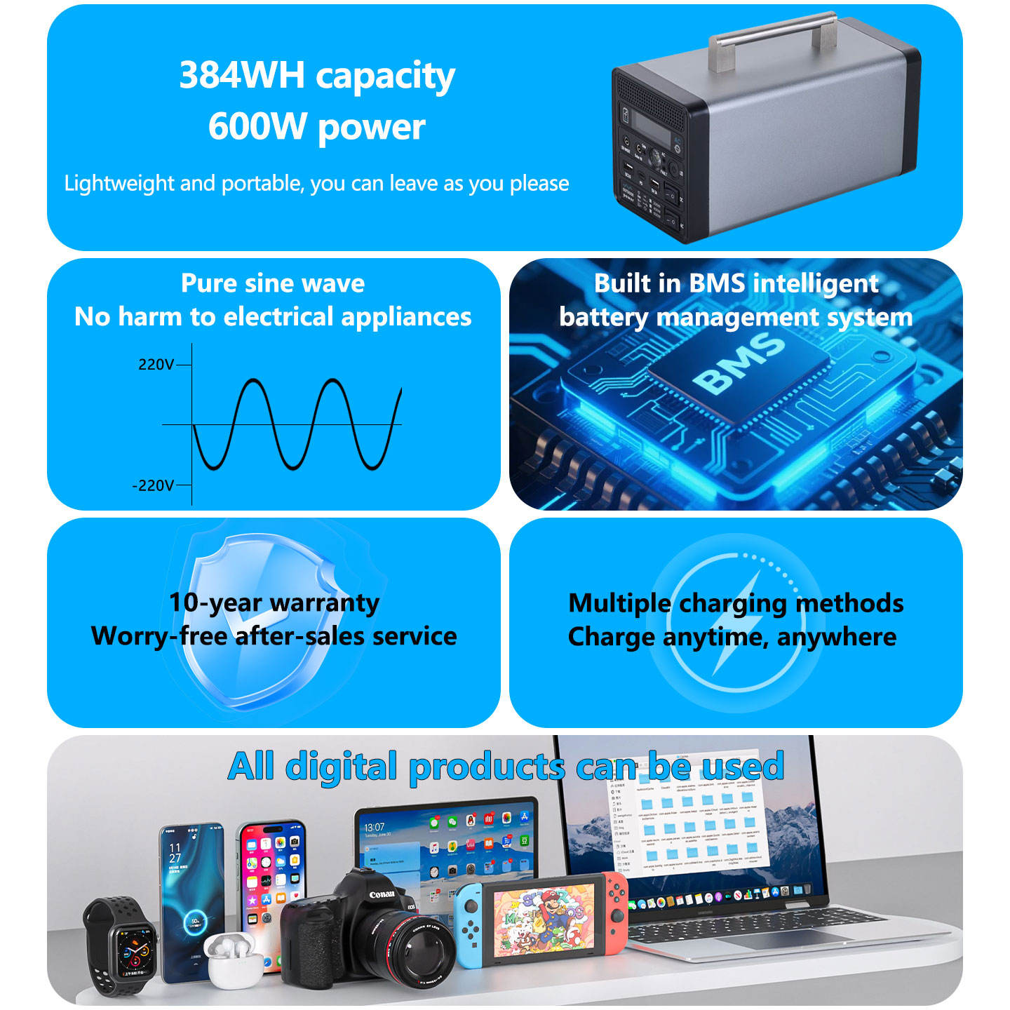 High-Power Portable Solar Power Station MPPT Charge Controller Pure Sine Wave UK Plug for Outdoor Camping Car Emergency Night