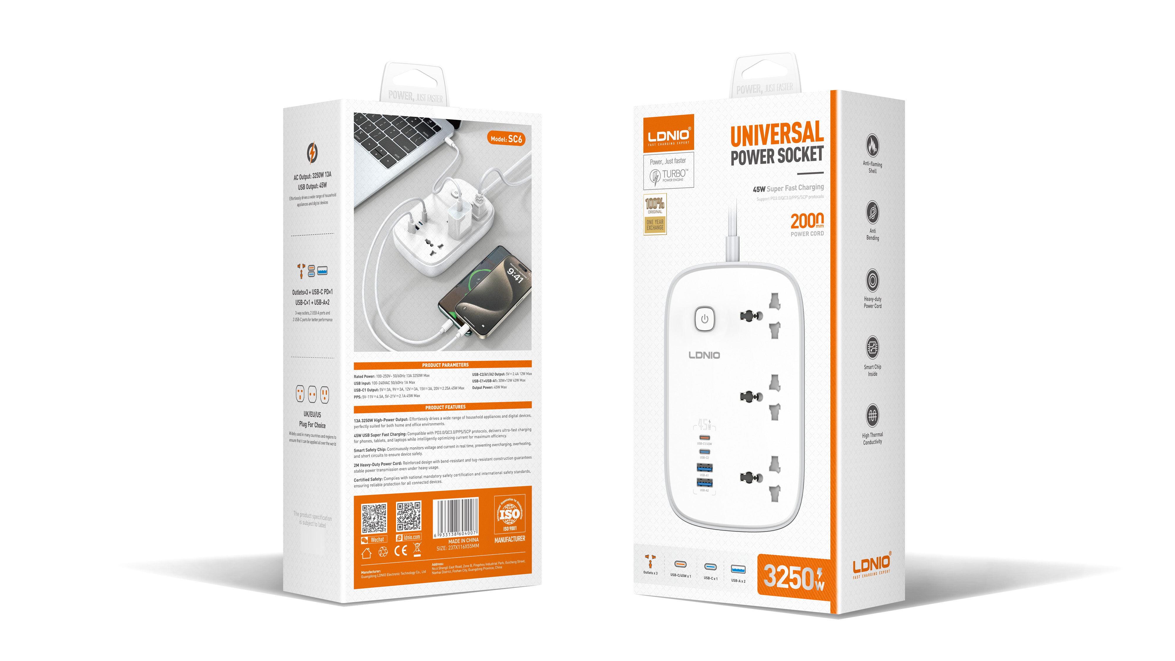 LDNIO--Power Strip--SC6 PD45W+3250W 3 universal outlets power strip