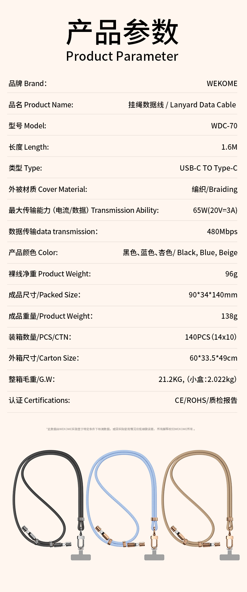 WDC-70 Lanyard-cable Data Cable 65W C-C